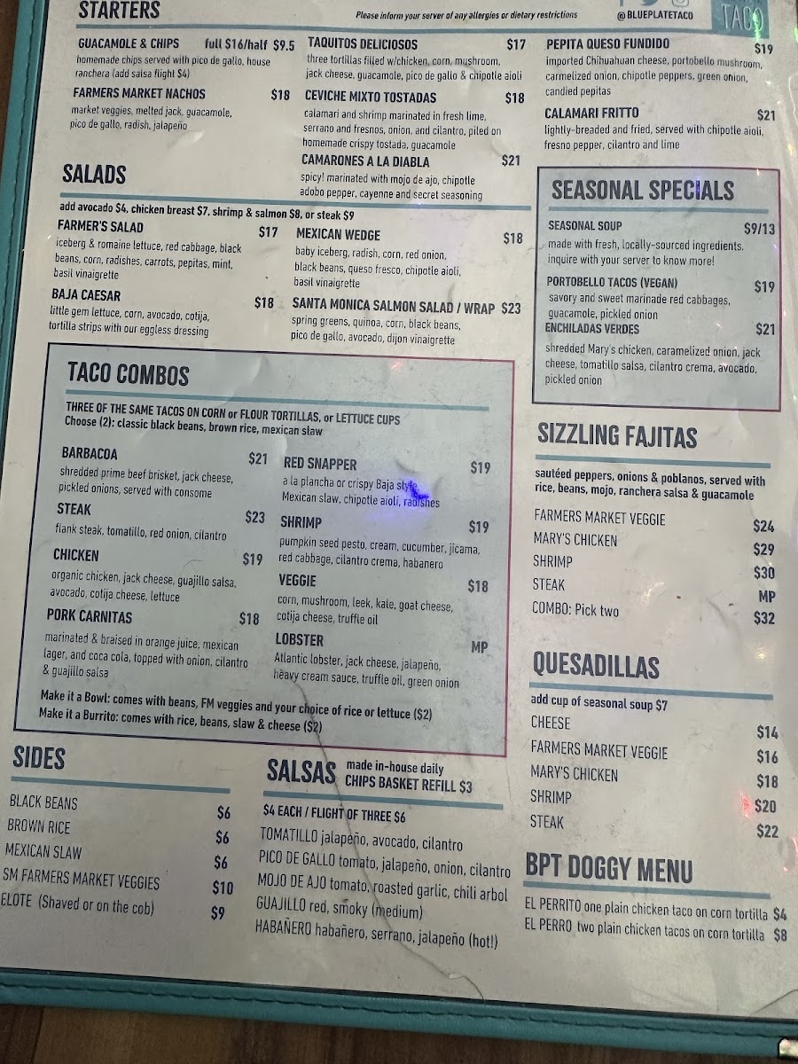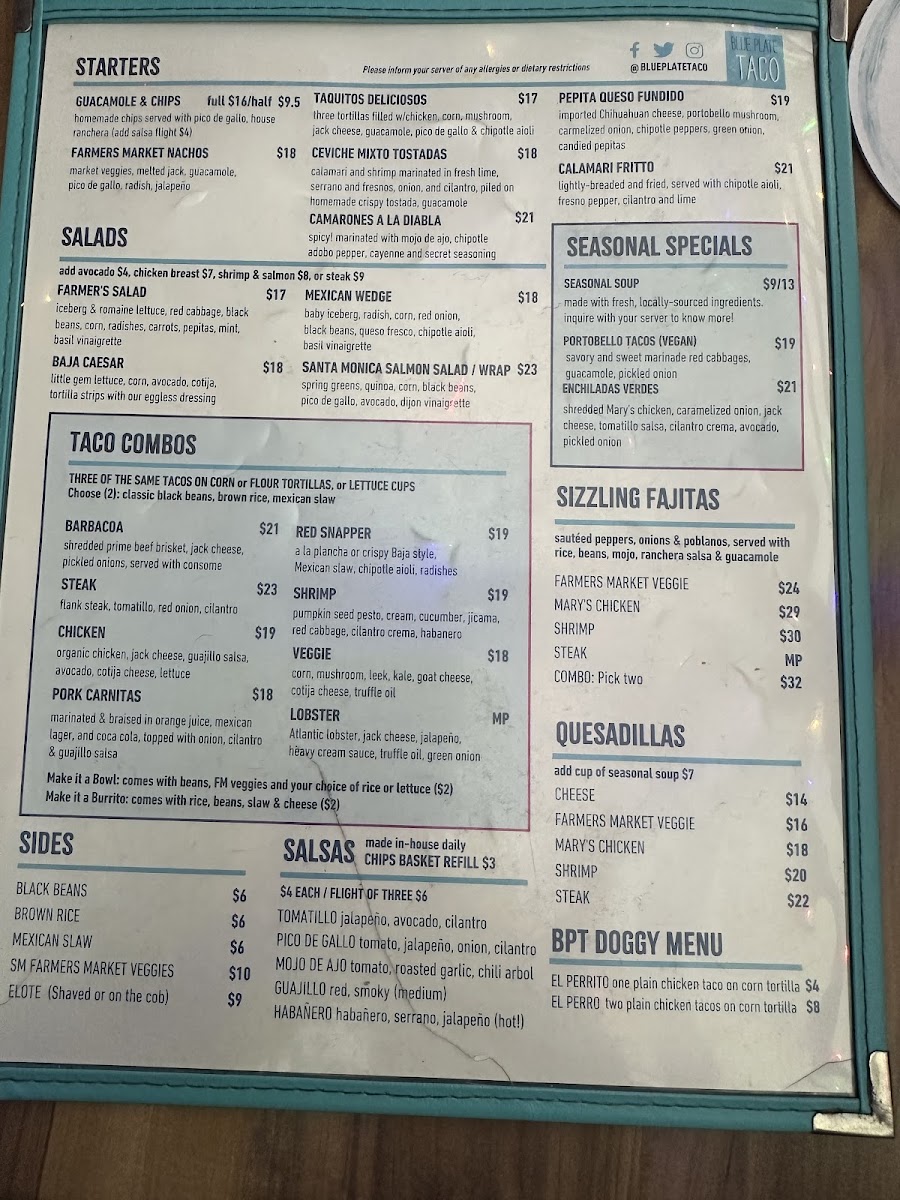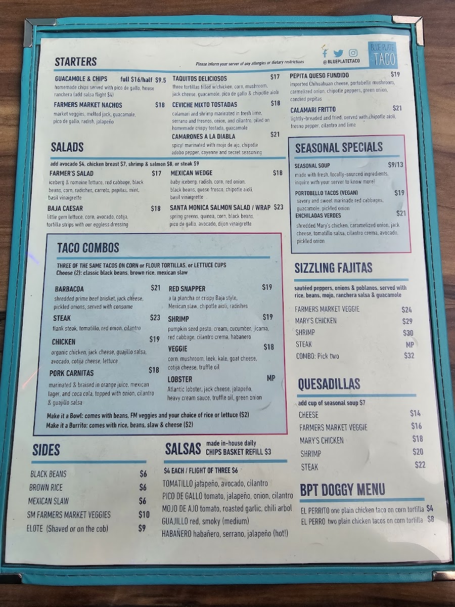 Blue Plate Taco, located at 1515 Ocean Ave in Santa Monica, CA, is a vibrant eatery renowned for its fresh, flavorful tacos and welcoming environment. With an inviting outdoor seating area perfect for people-watching, patrons can savor a variety of dishes while enjoying the coastal view. Diners rave about the delightful menu, which features tacos made with high-quality ingredients, as well as memorable options like grilled vegetable nachos and refreshing drinks like the ginger mojito. The attentive staff and lively atmosphere create a perfect backdrop for enjoying a delicious meal, making it a must-visit destination for locals and travelers alike.